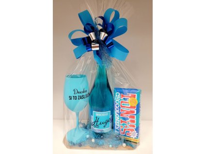 Modrý dárkový balíček s vínem Hugo Blue, čokoládou a skleničkou „Dneska si to zasloužím“ modrý dárkový set s vínem Hugo Blue, čokoládou Tony’s a vtipnou skleničkou 899 Kč