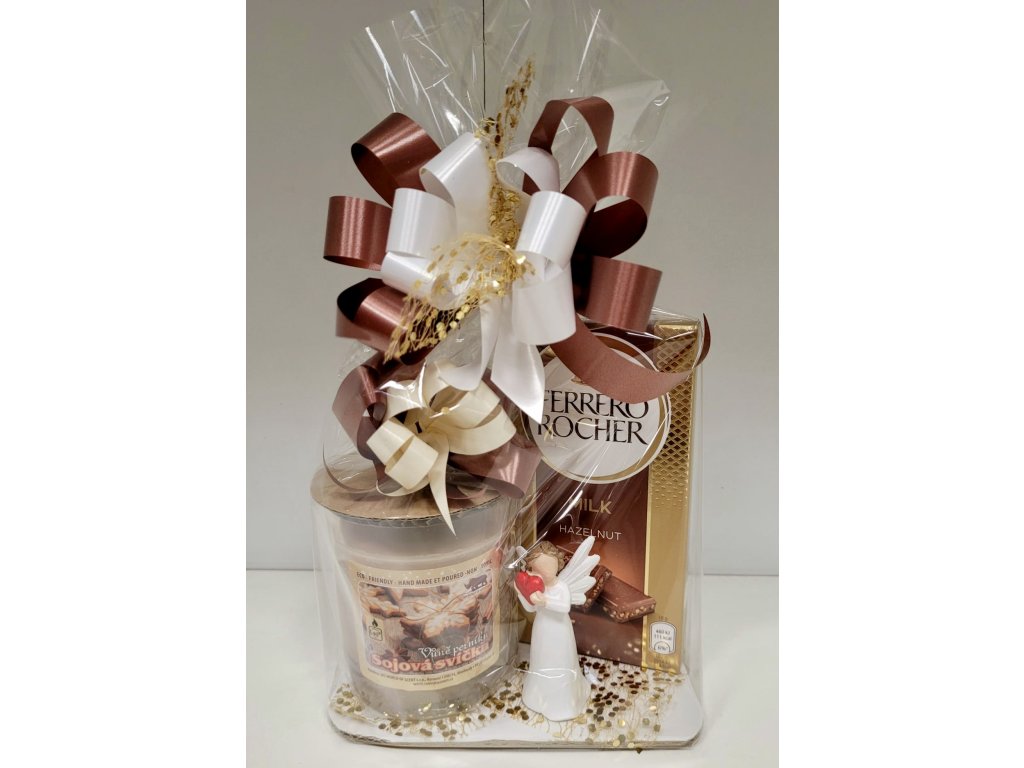 Něžný vánoční dárek v hnědo-zlatých tónech, který spojuje sladké pokušení a hřejivou vůni domova. Ferrero, sojová svíčka a andělská figurka – kombinace, která pohladí duši i chuťové buňky. ✨