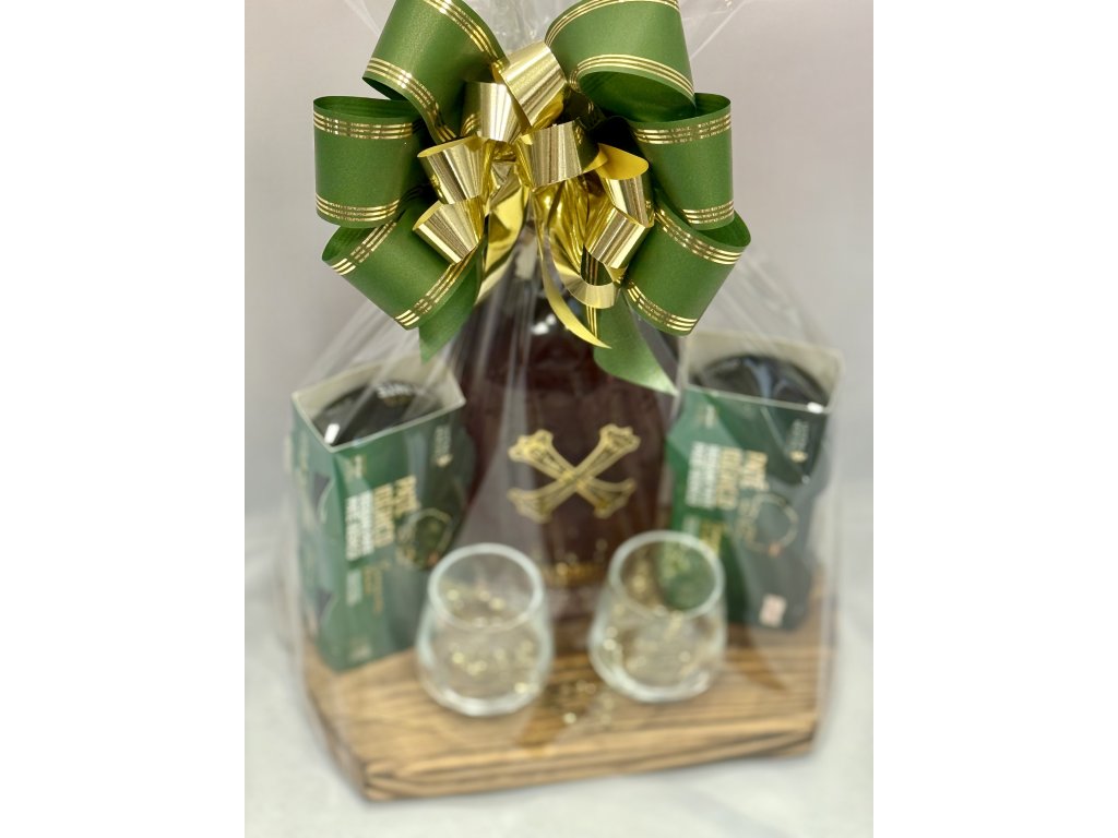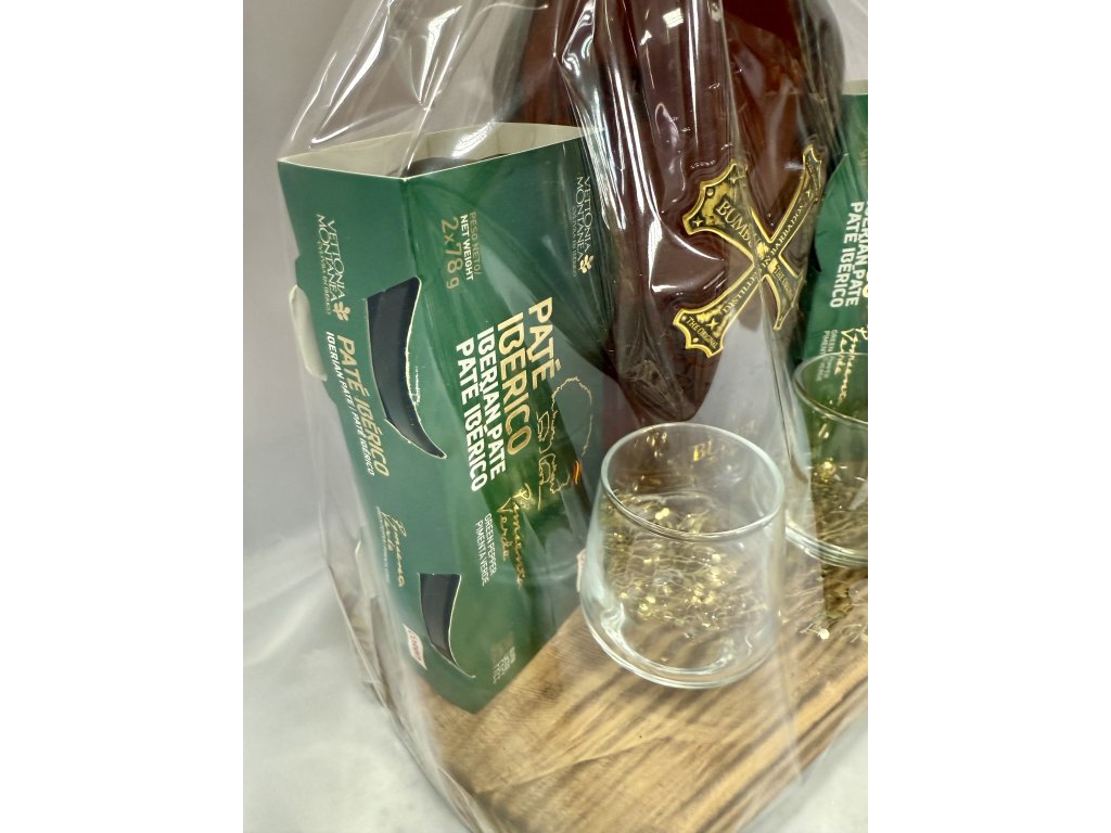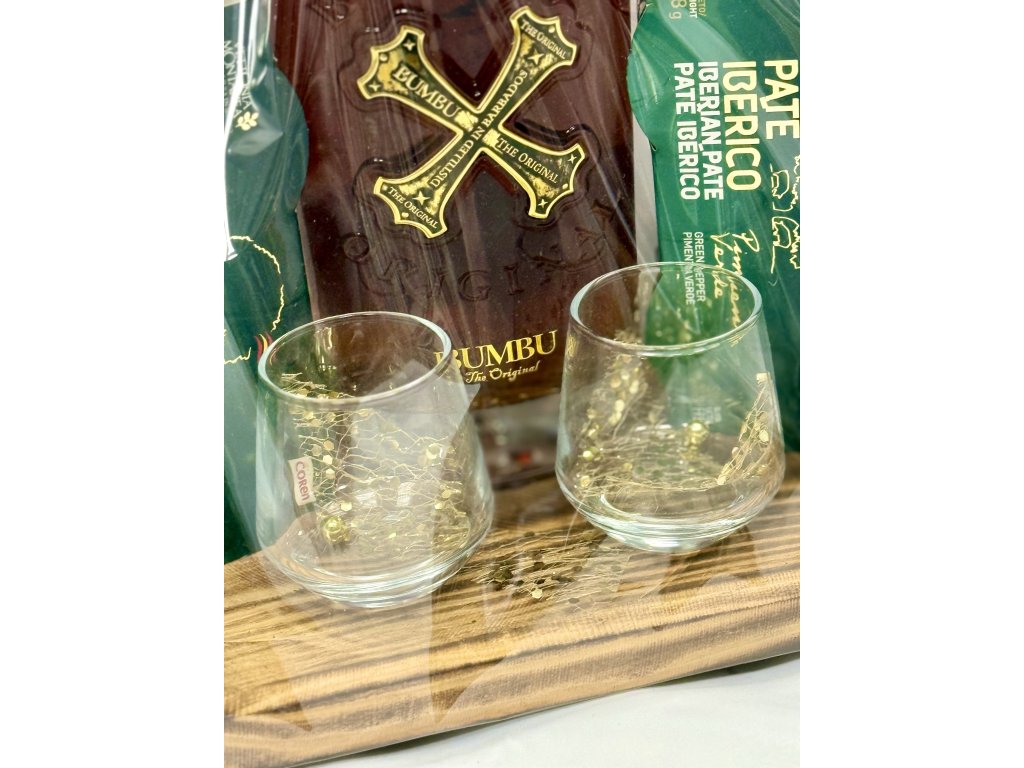 Dominantou balíčku je prémiový rum Bumbu Original, který doplňují delikátní paštiky Ibérico a dvojice skleniček, servírované na dřevěném prkýnku s elegantní mašlí v odstínech zelené a zlaté.