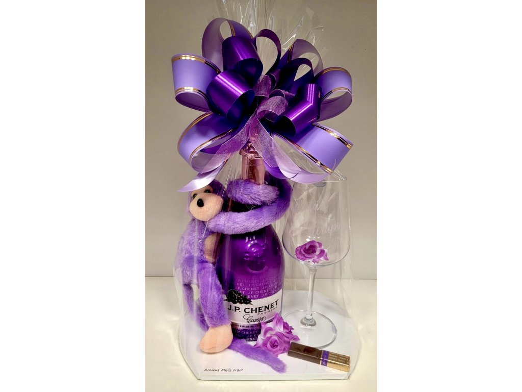 Obsahuje lahodné perlivé víno J.P. Chenet Cassis, stylovou skleničku s gravírováním „Tekutá terapie“ a měkoučkou plyšovou opičku, která se s úsměvem objímá kolem lahve.