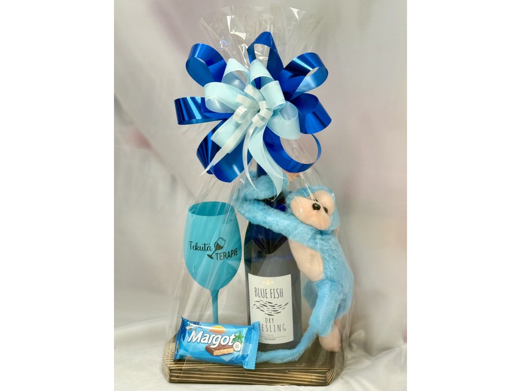 Obsahuje víno Blue Fish, skleničku s nápisem „Tekutá terapie“, plyšového opičáka a sladkou Margotku – vše krásně dárkově zabalené.