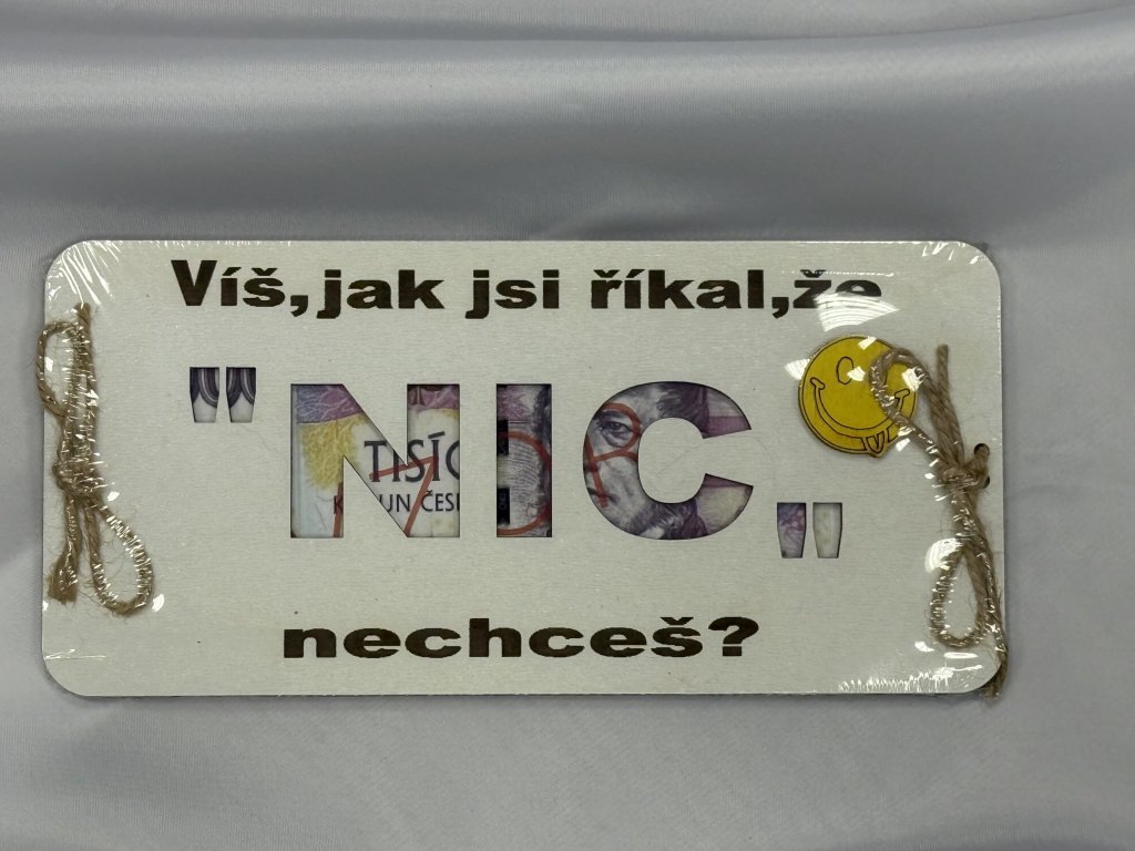 Na přední straně je nápis „Víš, jak jsi říkal, že NIC nechceš?“ s průhledem na imitaci bankovky, doplněný o žlutý smajlík a jutové provázky.