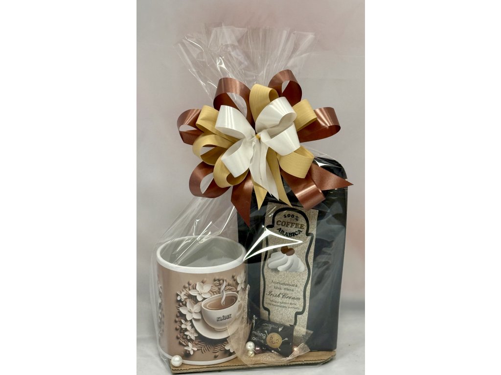 Obsahuje aromatizovanou mletou kávu Irish Cream, stylový hrníček a sladkou tečku – vše krásně zabalené v dárkovém celofánu se zlatohnědou mašlí.