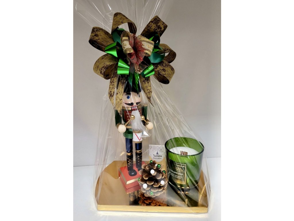 Dominantou balení je dřevěný louskáček v zeleno-zlatém kabátku, doplněný o vonnou svíčku v elegantním zeleném skle s dřevěným knotem a přírodní dekoraci z šišky.